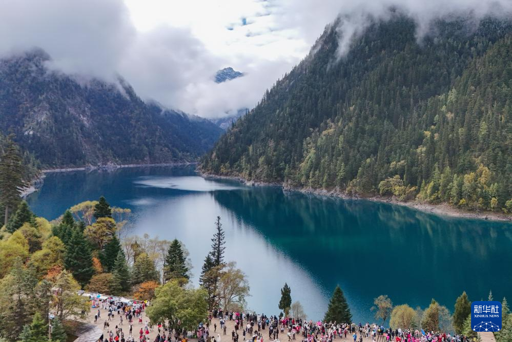 10月10日,游客在九寨沟景区长海游览观光(无人机照片)。