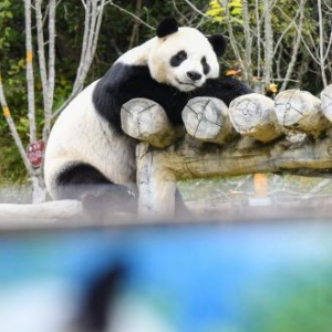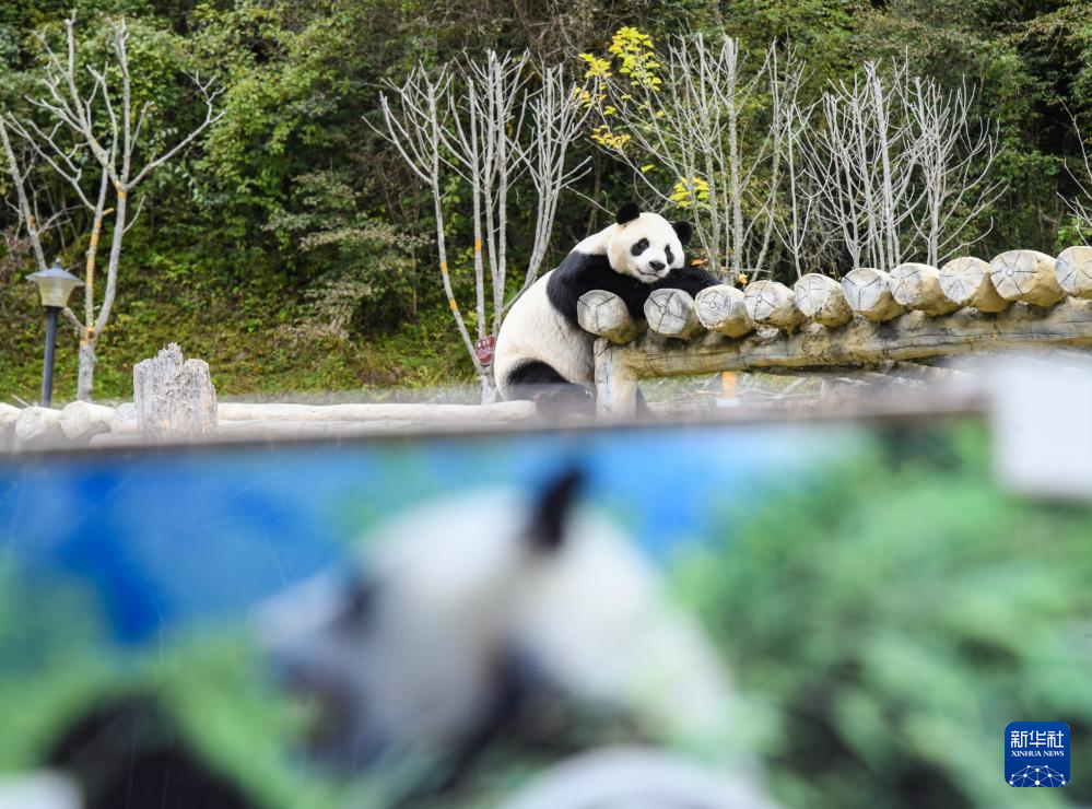 这是10月10日在九寨沟县景区甲勿海熊猫园拍摄的大熊猫“新新”。