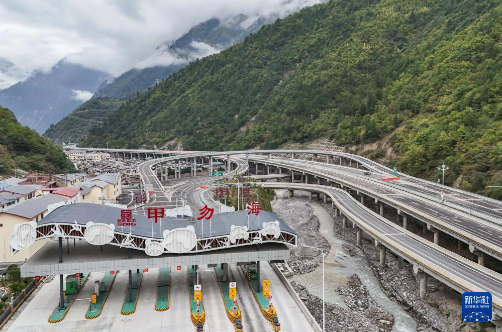 这是10月11日拍摄的正在建设中的九寨沟—绵阳高速公路甲勿海收费站(无人机照片)。九绵高速开通后,从成都至九寨沟县的时间将从原来的8小时缩短至4小时。