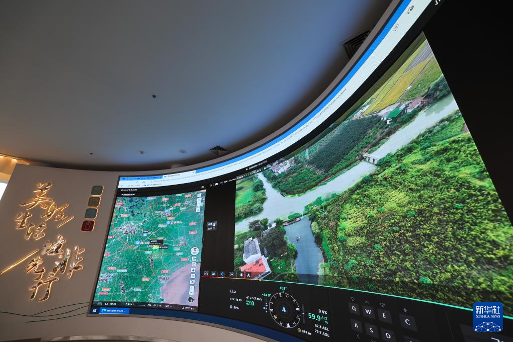 10月16日,在嘉兴市南湖区凤桥镇永红村的天旭航空培训基地的大屏幕上,巡查无人机传回了实时河道巡查画面。凤桥镇永红村利用无人机开展常态化农村人居环境、河道管理、耕地保护等日常巡查。
