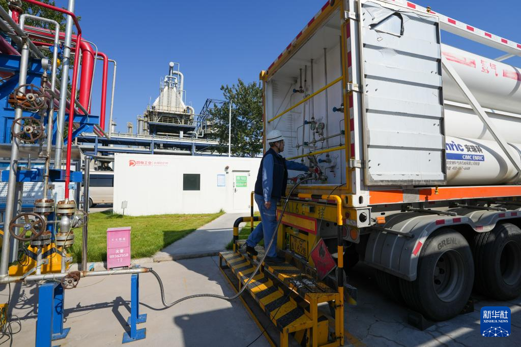 10月15日,在中国石化燕山石化公司,一名工作人员在给一辆氢气管束车充装氢气。