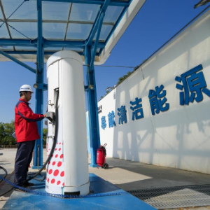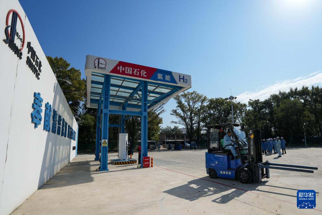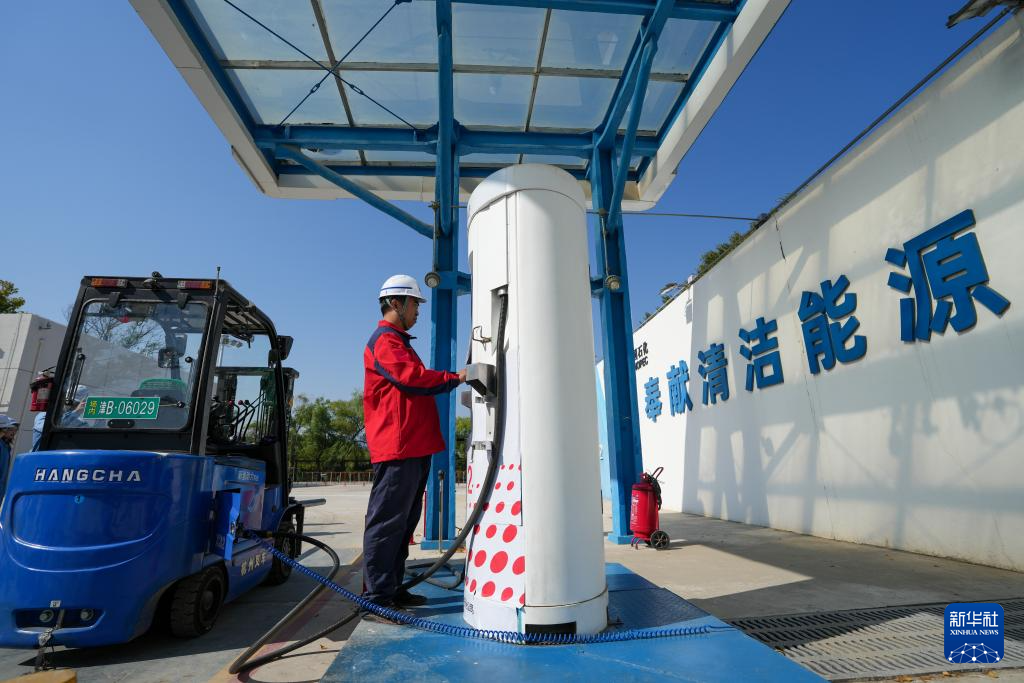 10月15日,在中国石化燕山石化公司的加氢站,一名工作人员在为一辆氢能叉车加氢气。