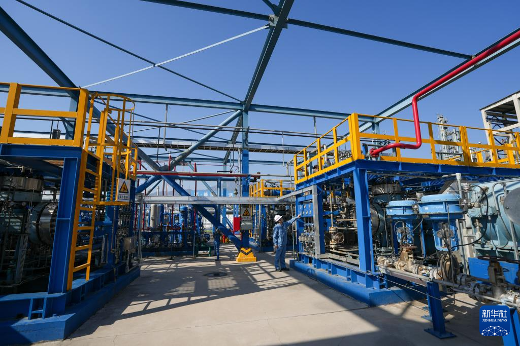 10月15日,在中国石化燕山石化公司,一名工作人员在氢气新能源装置旁巡视。