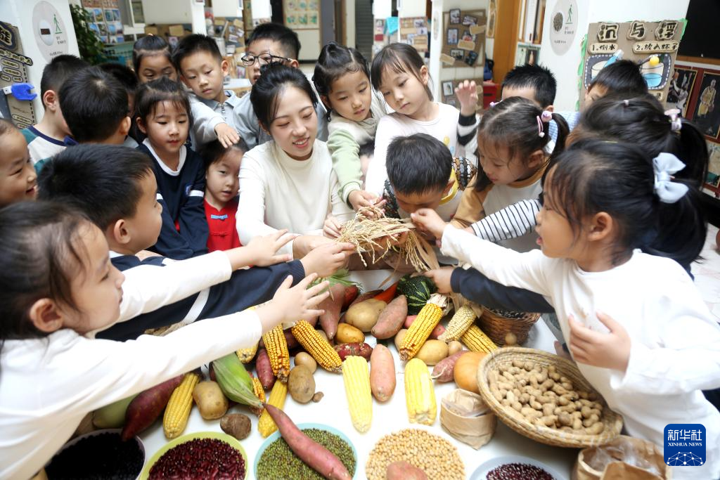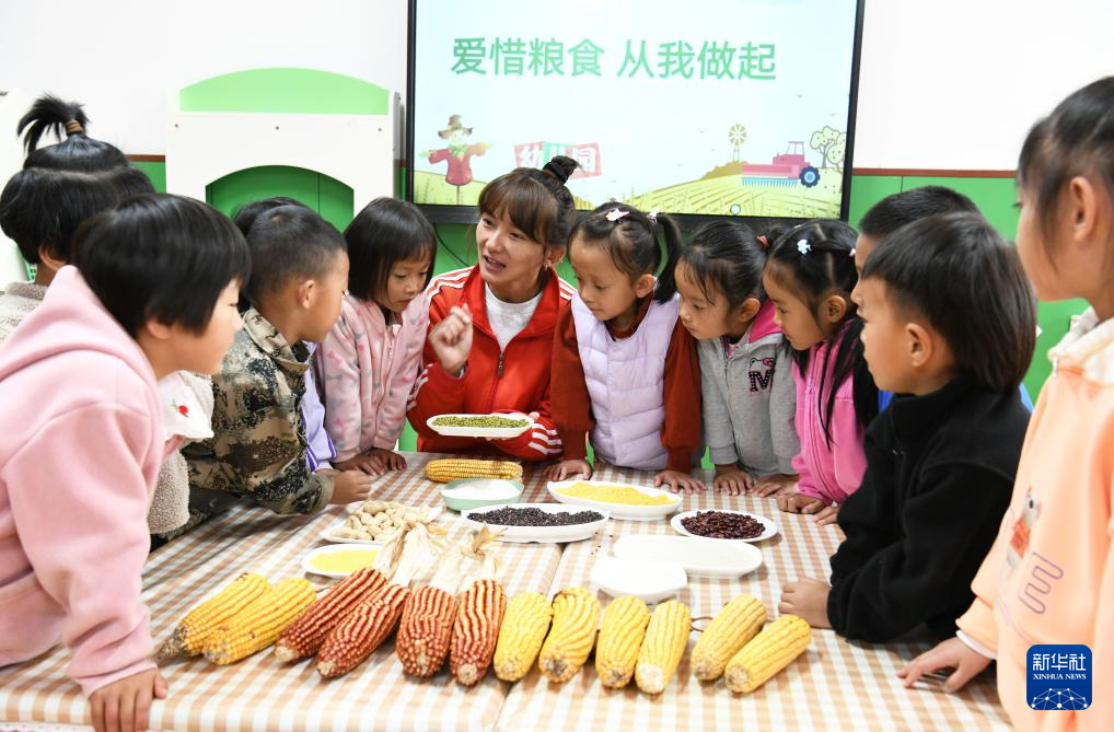 10月16日,在河南省济源市愚公路幼儿园,老师教小朋友认识粮食。