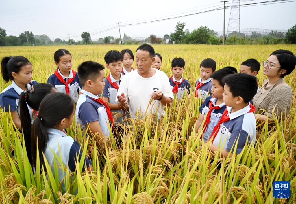10月16日,山东省临沂市沂南县张庄镇中心小学的学生在老师的带领下学习水稻知识。