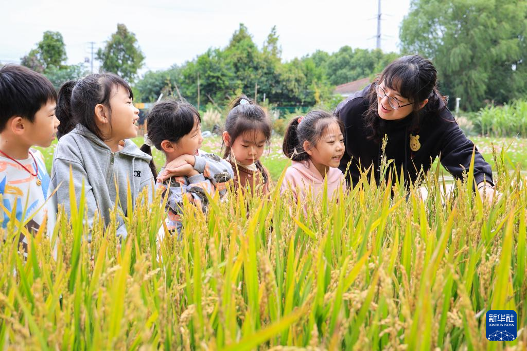 10月16日,在南京市永安花苑幼儿园,老师在种植园里给小朋友们讲解水稻知识。
