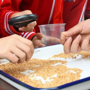 10月16日,在四川省阆中市,小学生在四川省储备粮集团阆中储备库工作人员的指导下学习挑选小麦中的不完善粒。