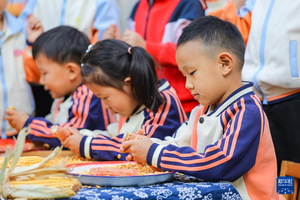10月16日,云南省丽江市新苗幼儿园的老师教小朋友认识五谷杂粮。