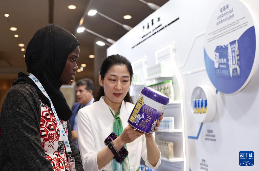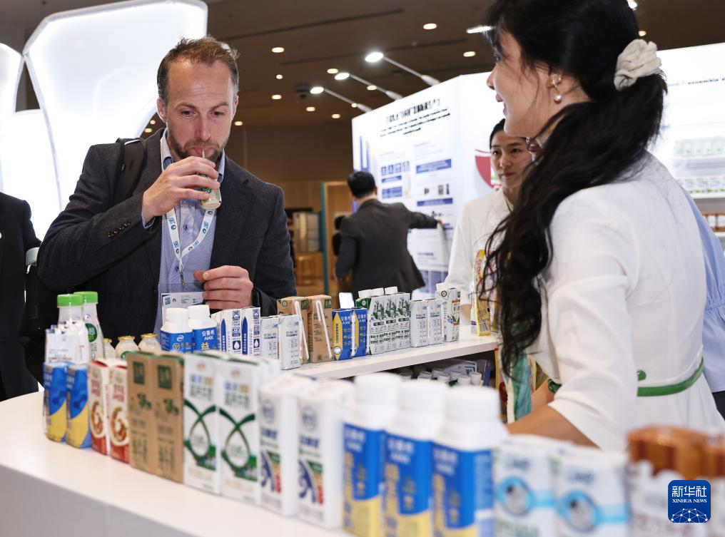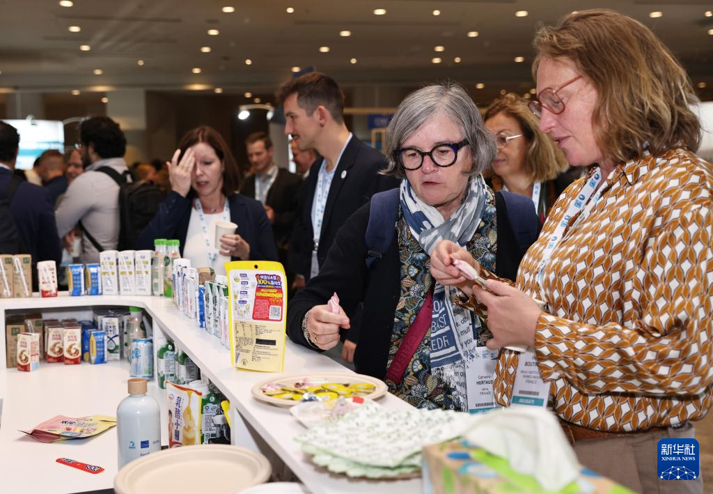 10月15日,在法国巴黎举行的2024世界乳业峰会上,与会嘉宾参观中国乳业品牌展台。