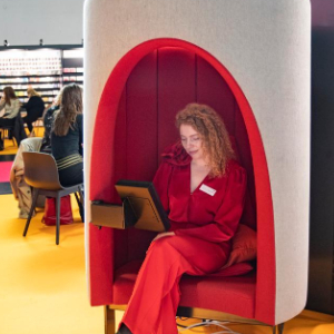 10月16日,一名女子在德国法兰克福书展上体验有声书。