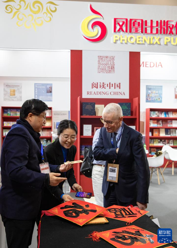 10月16日,参观者在德国法兰克福书展凤凰出版集团展区交流。