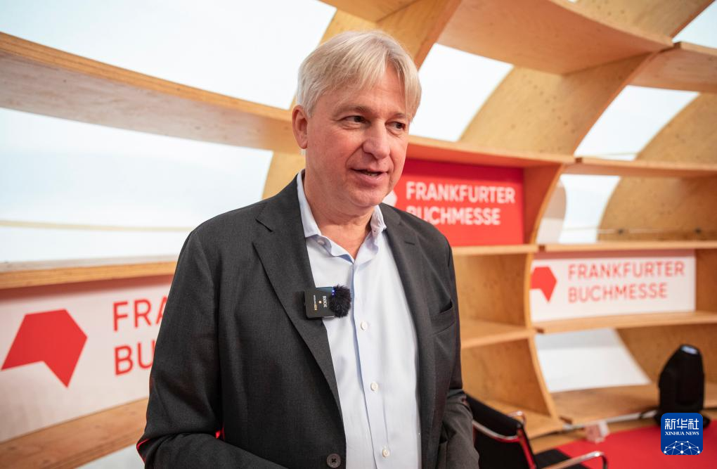 10月15日,法兰克福书展主席于尔根·博斯在德国法兰克福书展开幕式活动上接受采访。