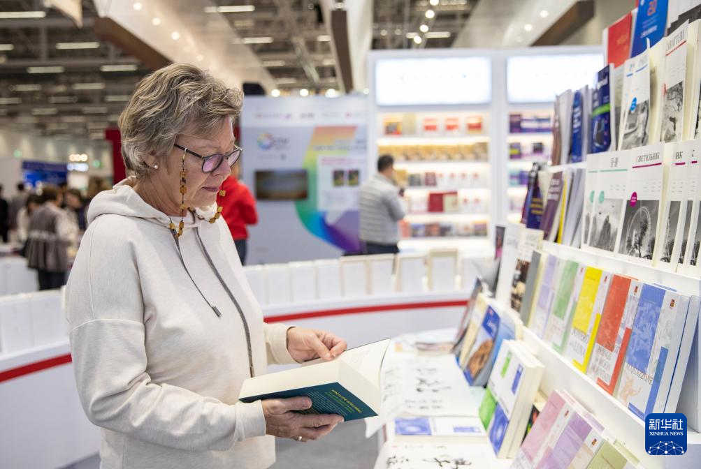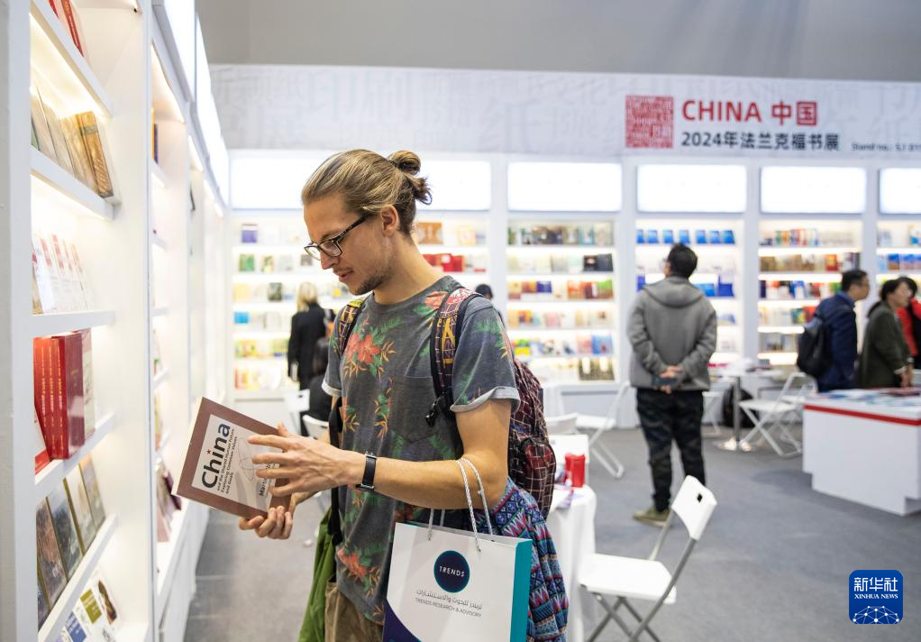 10月17日,一名参观者在德国法兰克福书展中国联合展台翻阅图书。