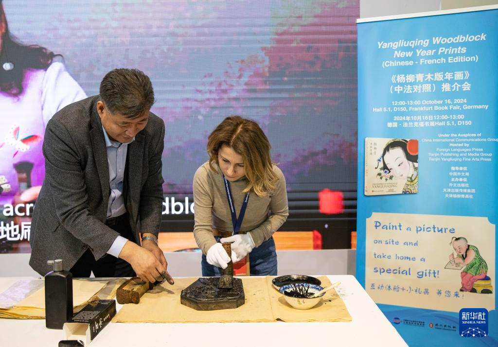 10月16日,一名参观者在德国法兰克福书展中国出版商展区体验木版年画制作工艺。