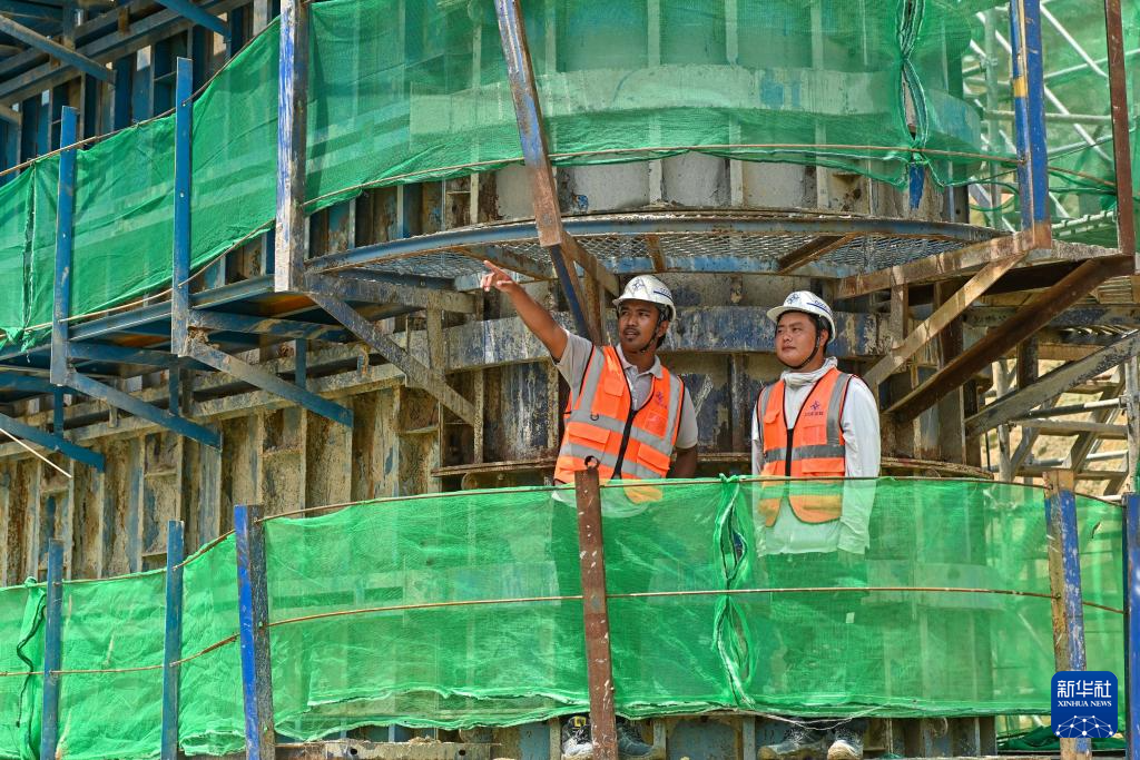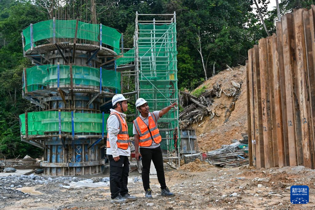 10月11日,在马来西亚雪兰莪州,中交马东铁项目现场工程师阿兹里尔·哈基姆(左)与马东铁鹅唛车站施工负责人陈威柏(右)在施工现场视察工程。