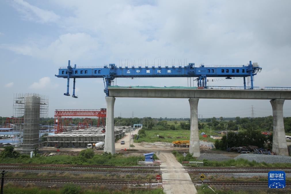 这是5月6日在马来西亚彭亨州航拍的马东铁项目的铺轨现场。