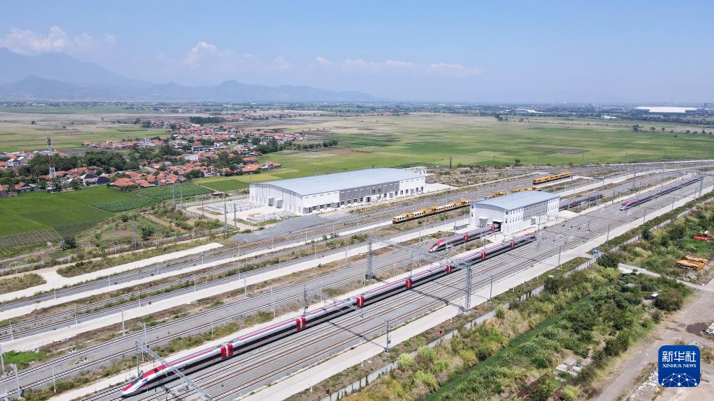 9月13日,在印度尼西亚万隆,雅万高铁动车组列车停靠在德卡鲁尔动车所附近(无人机照片)。