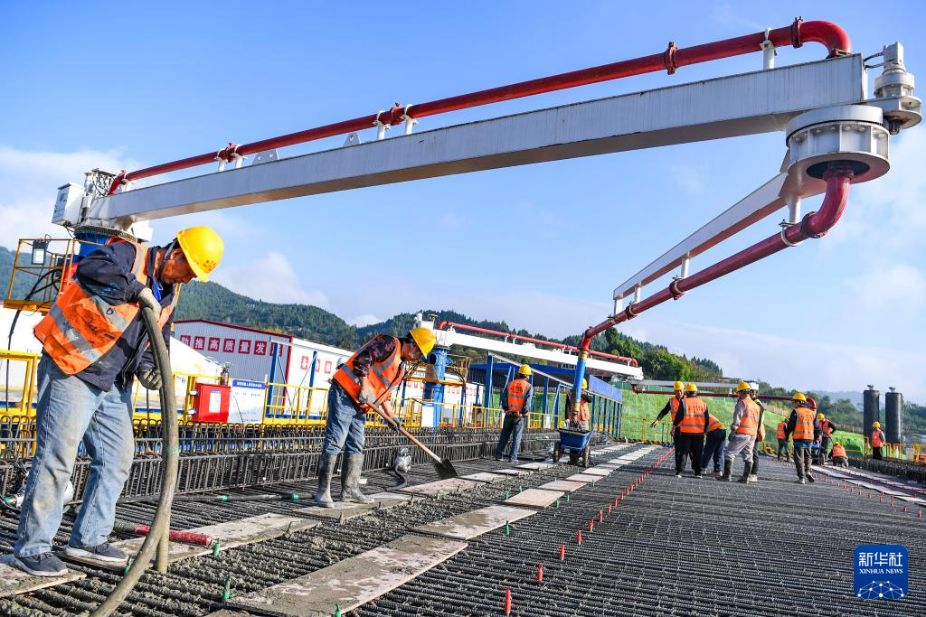 10月18日,在中铁十一局渝万高铁万州响水镇制梁场,工人在进行预制箱梁浇筑作业。