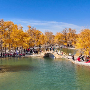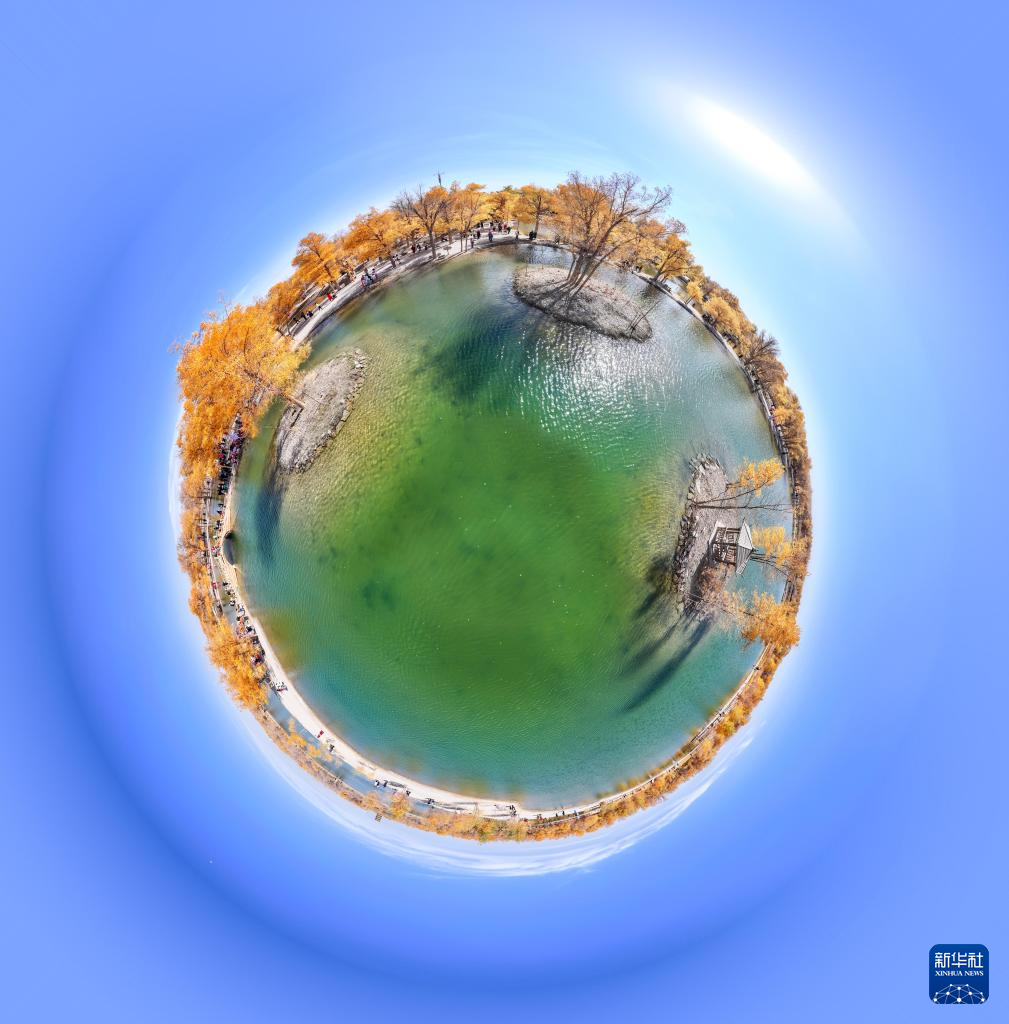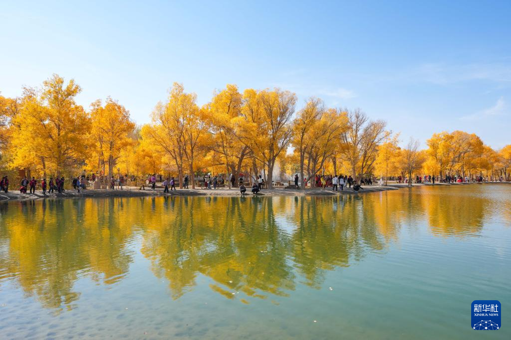 金秋时节,位于甘肃省酒泉市金塔县的金塔沙漠胡杨林景区迎来最佳观赏季,金黄的胡杨林与蓝天、湖泊交相辉映,美如画卷。