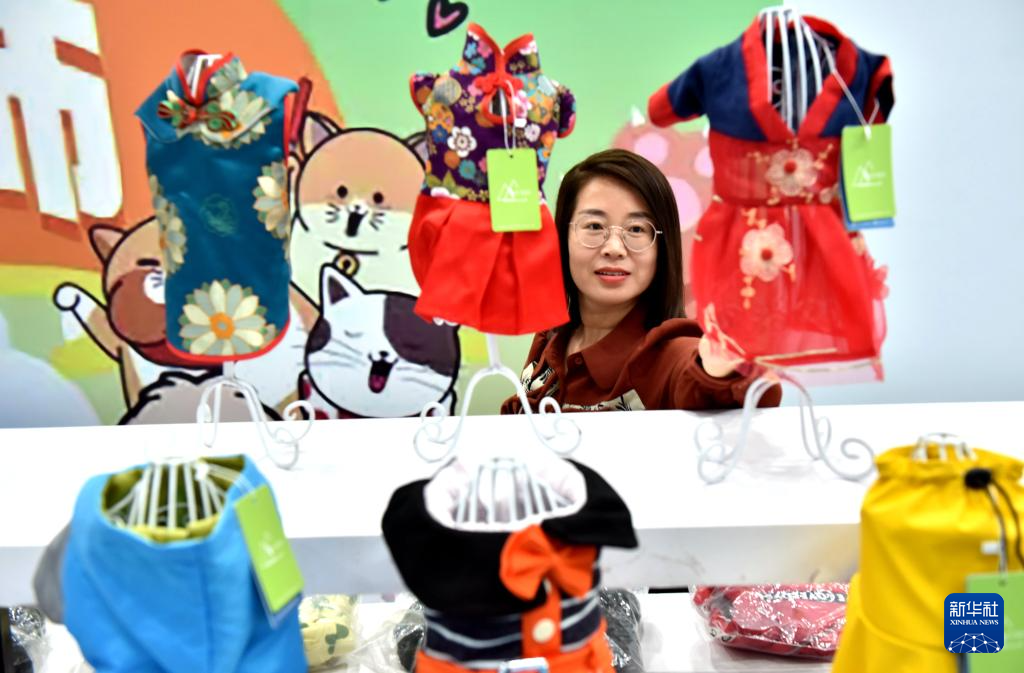 10月18日,观众在宠物产业博览会上挑选为宠物设计的衣物。