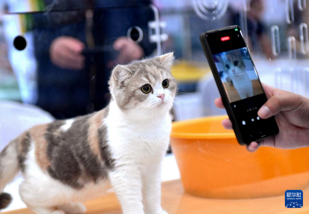 10月18日,观众在宠物产业博览会上给宠物猫拍照。