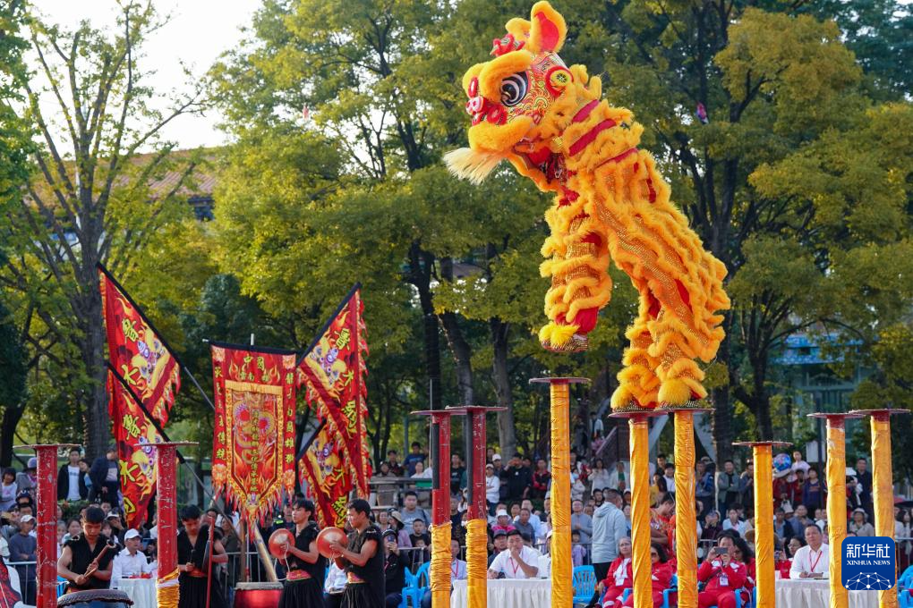 10月19日,云南鲁木纳龙狮艺术团队员在南狮高桩自选套路项目中比赛,最终他们获得该项目铜奖。