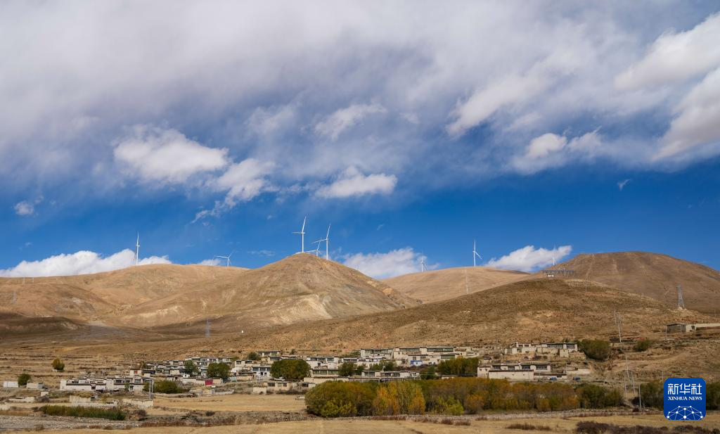 10月17日拍摄的位于西藏日喀则市萨迦县的风力发电机组及山脚下的村庄。