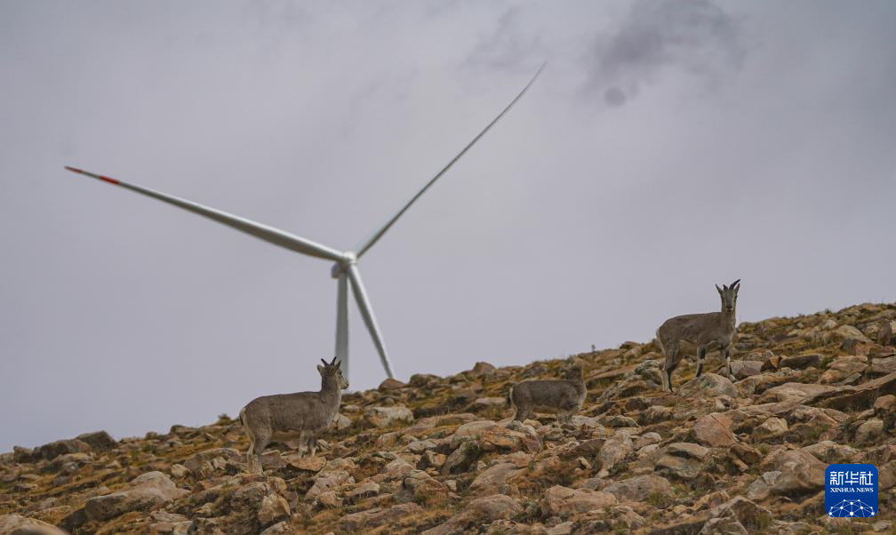 10月17日拍摄的位于西藏日喀则市萨迦县的风力发电机组及周围山上的野生动物。