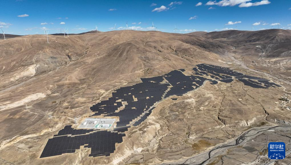 10月17日拍摄的位于西藏日喀则市萨迦县的中核萨迦300兆瓦风光储一体化电站(无人机照片)。