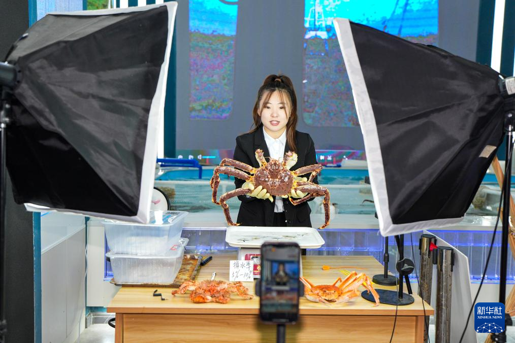 9月20日,在吉林省珲春市的帝王蟹保税店内,工作人员进行网络直播售卖帝王蟹。