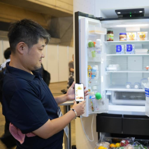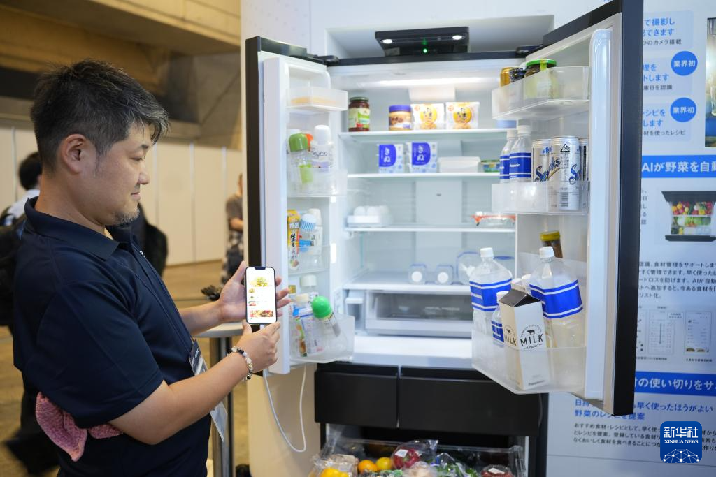 这是10月17日在日本千叶县举行的日本高新技术博览会上拍摄的,日本松下公司展区搭载AI摄像头的冰箱。
