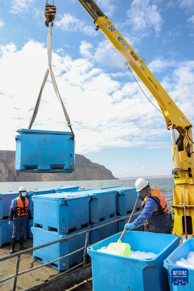 10月18日,龙洋知鲜(青海)股份有限公司员工给冷水鱼加冰块保鲜。