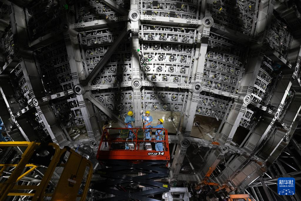 据中国科学院高能物理所消息,江门中微子实验建设目前已经进入收官阶段。这是工人在安装中心探测器上的光电倍增管(10月10日摄)。