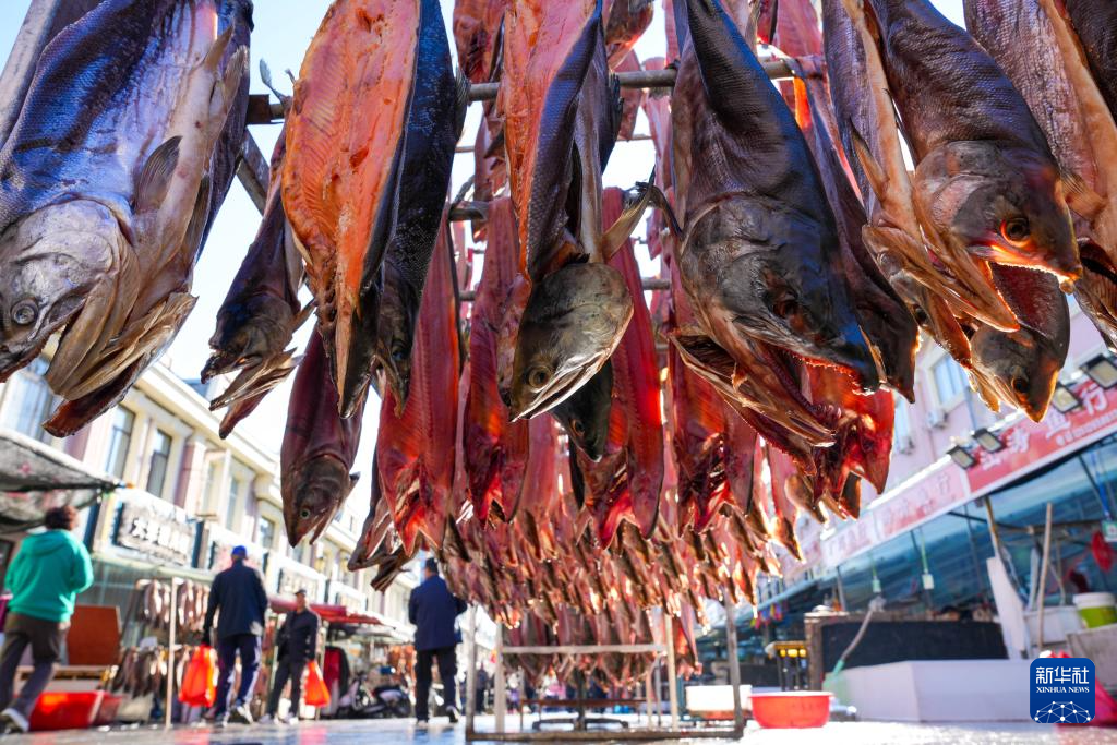 10月11日,在黑龙江省抚远市的东极鱼市上挂着供市民选购的鱼产品。