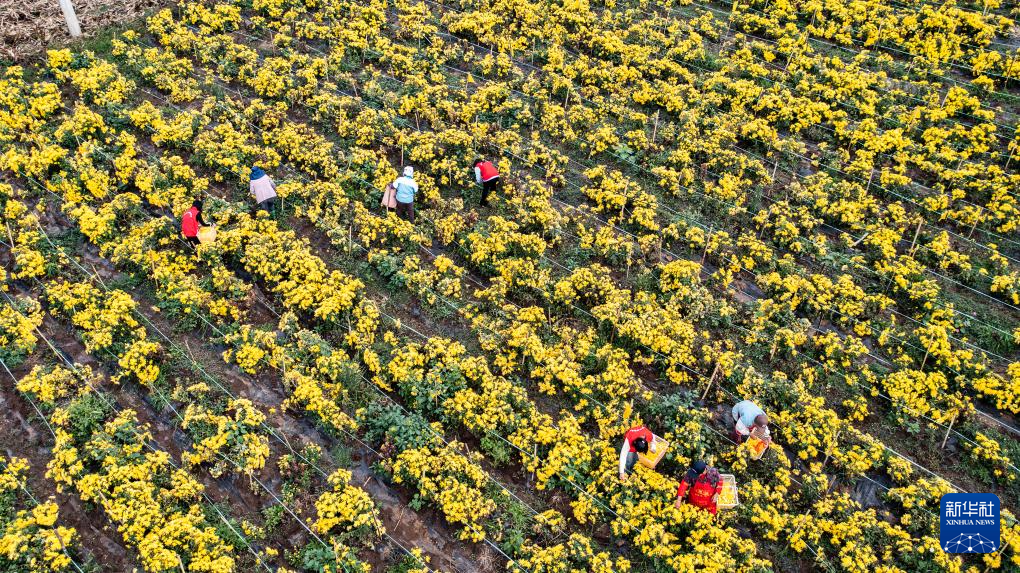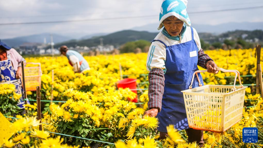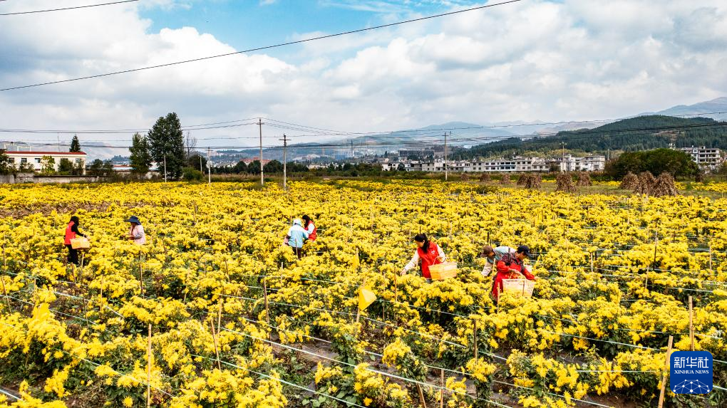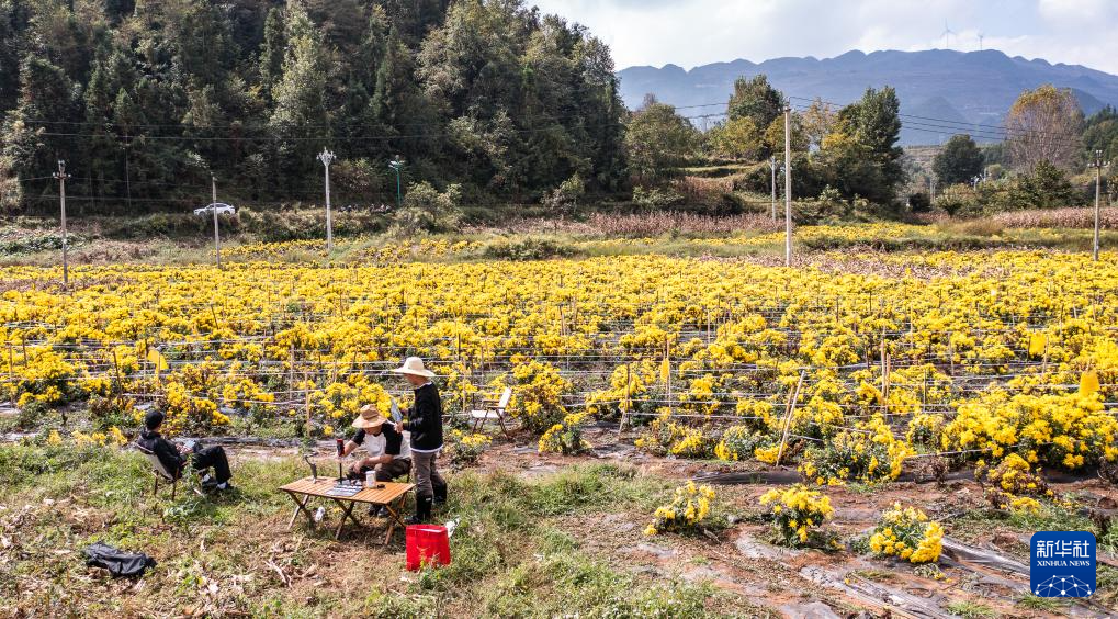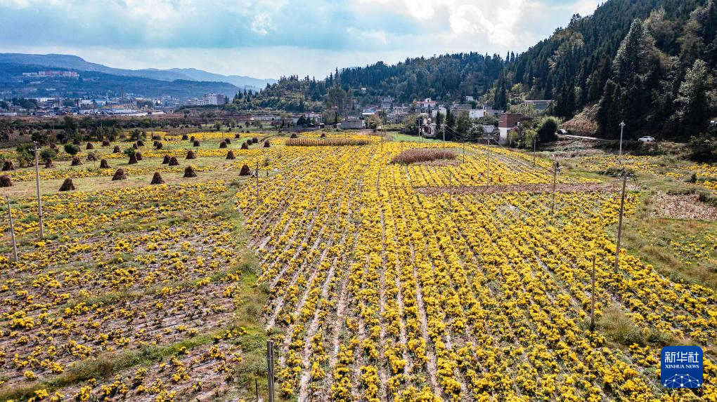金秋时节,贵州省六盘水市钟山区大湾镇种植的300余亩金凤菊喜获丰收,田间地头一派繁忙景象。近年来,当地采取“公司+基地+农户”的形式发展菊花种植加工产业,以土地流转、用工等形式带动周边群众就业增收。