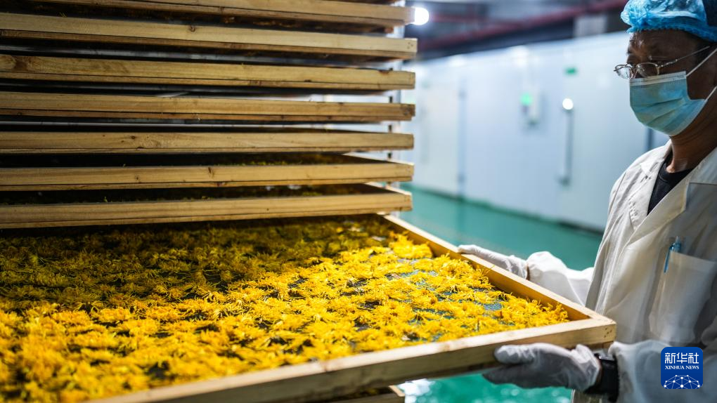 工作人员在加工车间内查看金凤菊烘干情况(10月19日摄)。