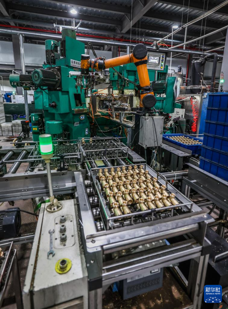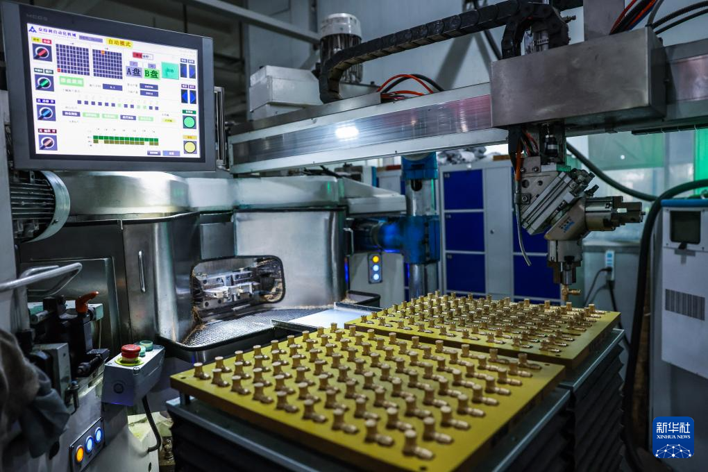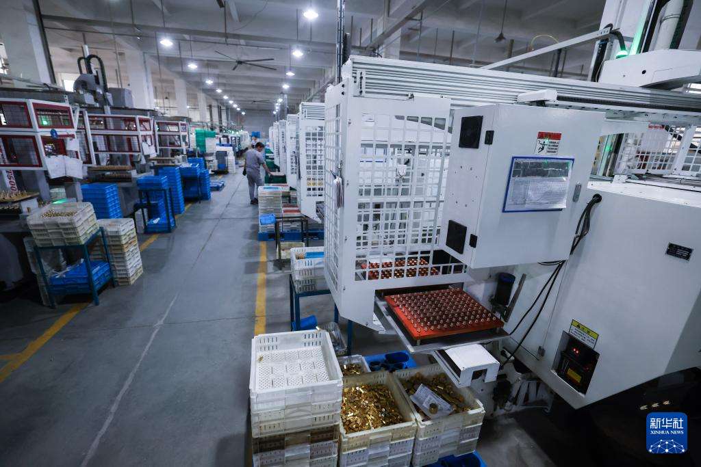 10月20日,在浙江铭仕兴新暖通科技股份有限公司的瓶阀体加工区,自动化设备在生产用于出口的阀门配件。位于诸暨市店口镇的浙江铭仕兴新暖通科技股份有限公司通过引进自动化新设备降本增效,2024年上半年外贸出口订单量逆势上扬,实现了两位数增长。