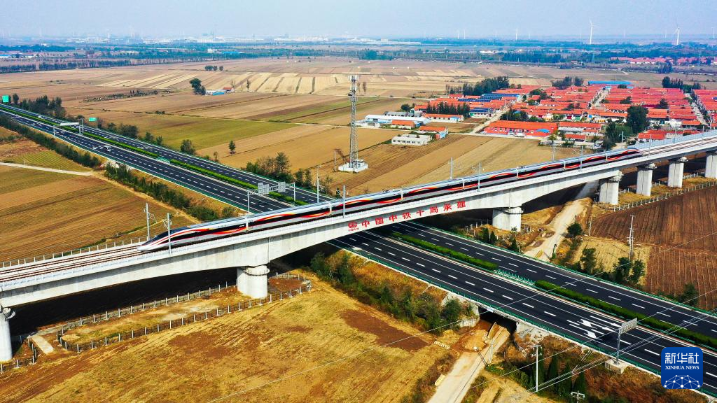 10月21日,一辆复兴号列车驶过潍烟高铁昌平特大桥。