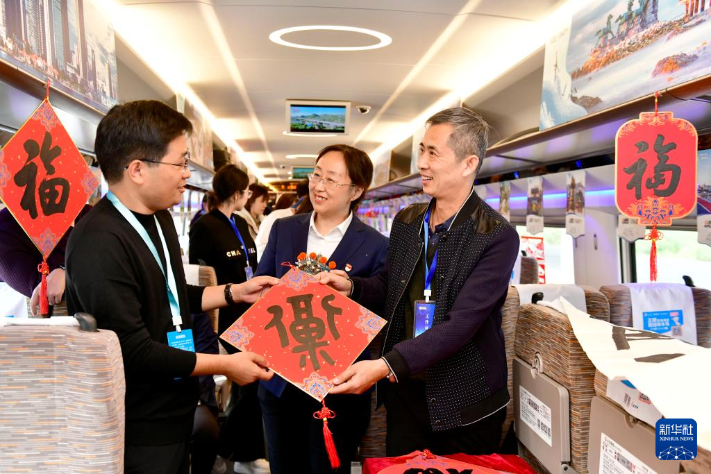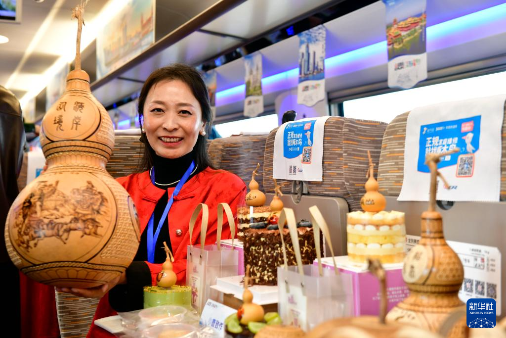 10月21日,在潍烟高铁复兴号G9227首发列车上,烟台文旅部门的工作人员向潍烟高铁参建者送礼物。