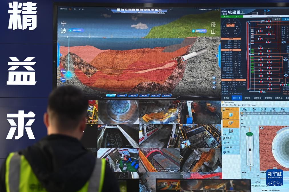 10月22日,中铁十一局技术人员通过甬舟铁路金塘海底隧道数字孪生平台进行远程施工管理,屏幕上显示盾构机已进入海域段掘进施工。