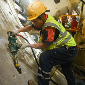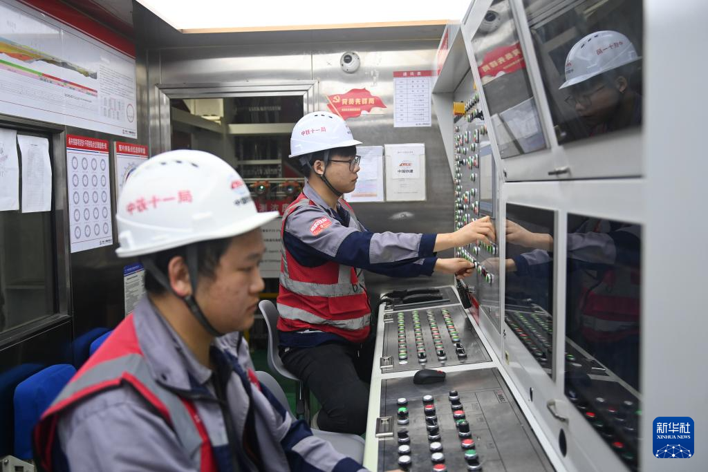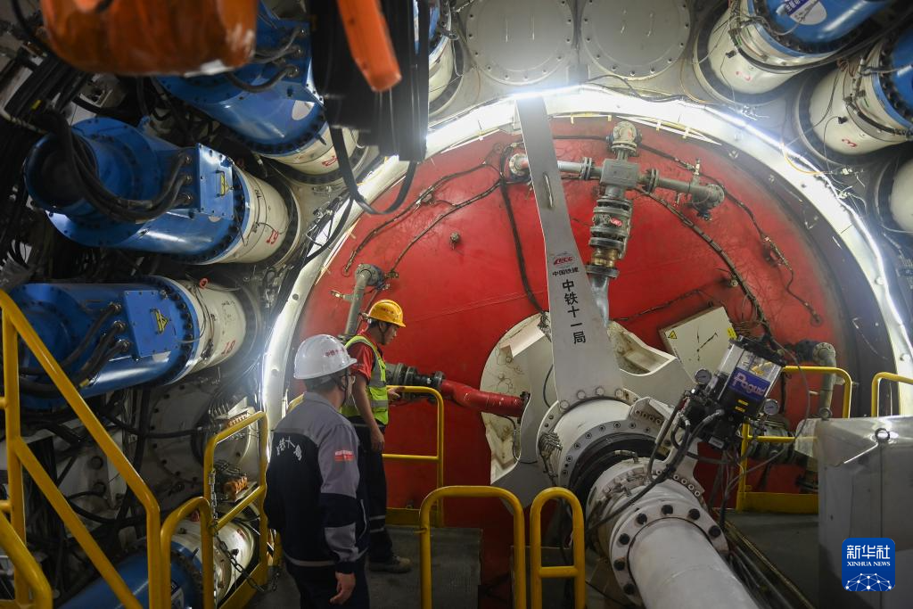 10月22日,中铁十一局技术人员在甬舟铁路金塘海底隧道“定海号”盾构机内作业。