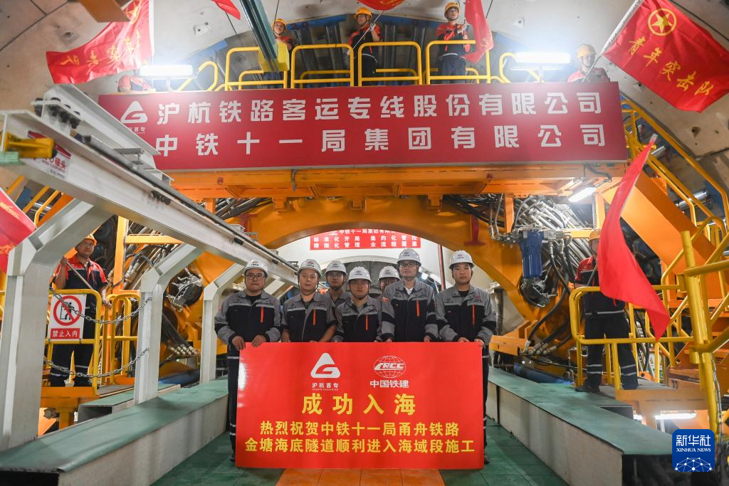 当日,在甬舟铁路金塘海底隧道舟山侧海平面下42米深处,“定海号”盾构机成功穿越海堤,由陆域段进入海域段掘进施工,标志着这条海底高铁隧道建设开启“穿海之旅”。