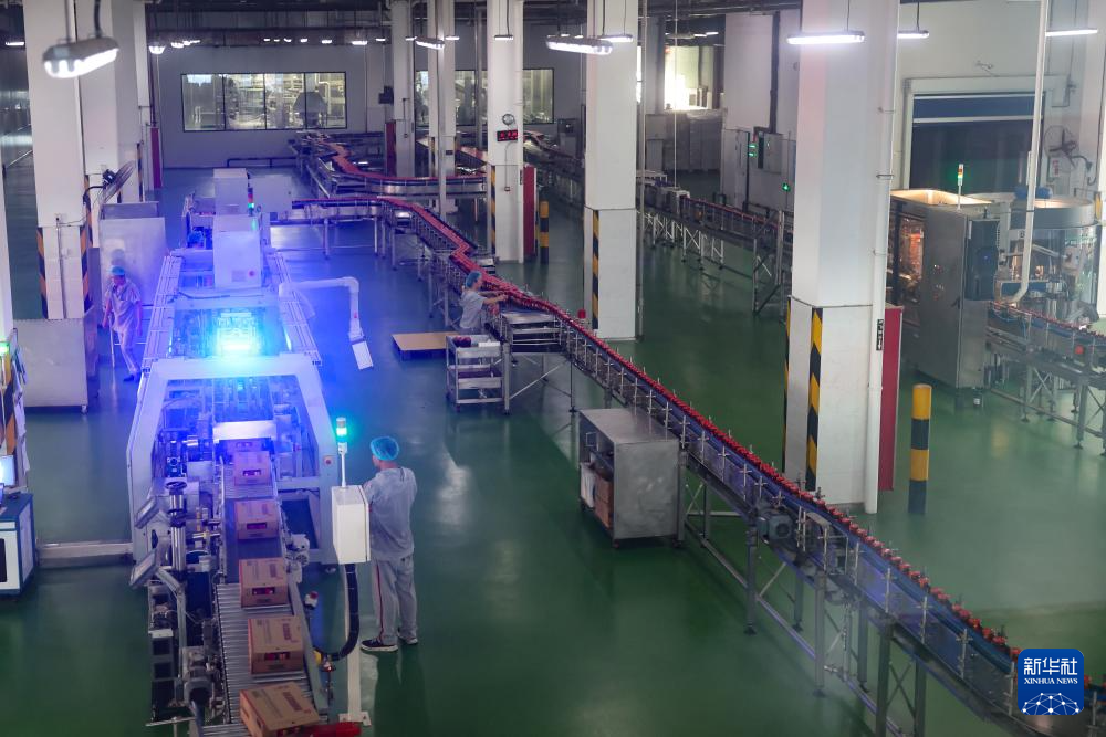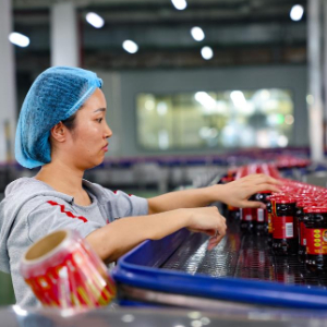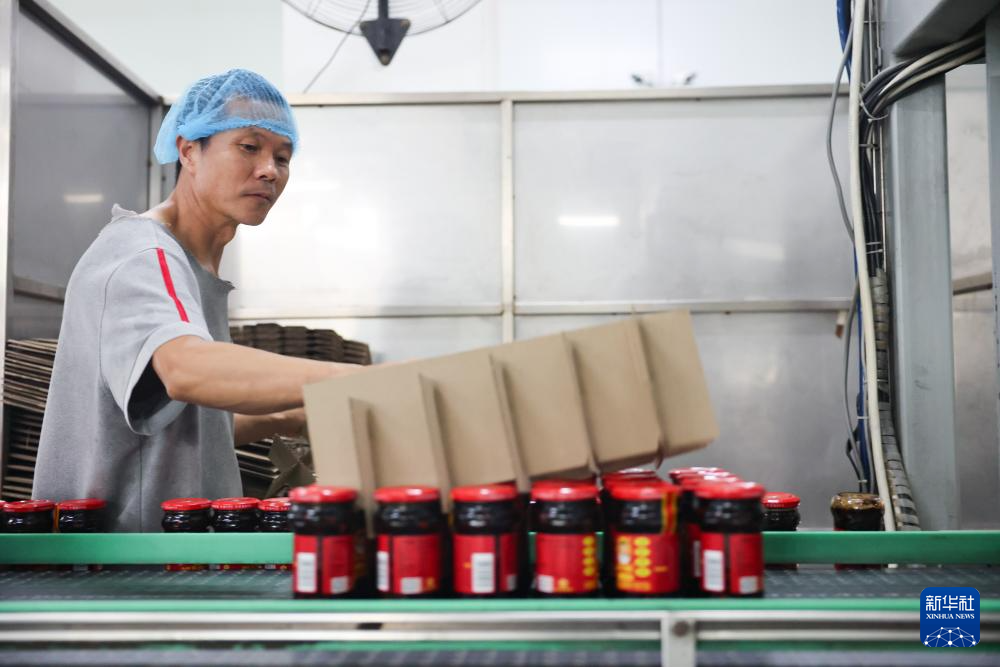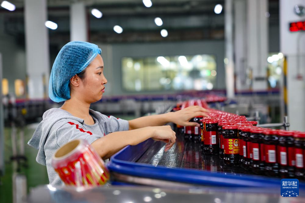工作人员在老干妈生产线上整理货品(8月20日摄)。
