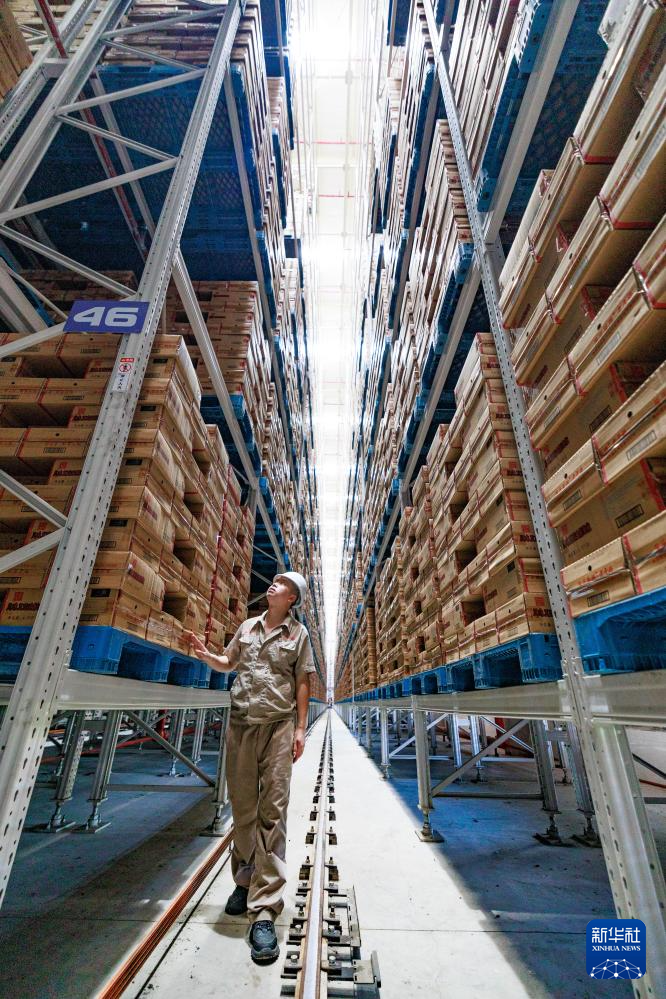 工作人员在老干妈仓库内查看存储的货物(8月20日摄)。