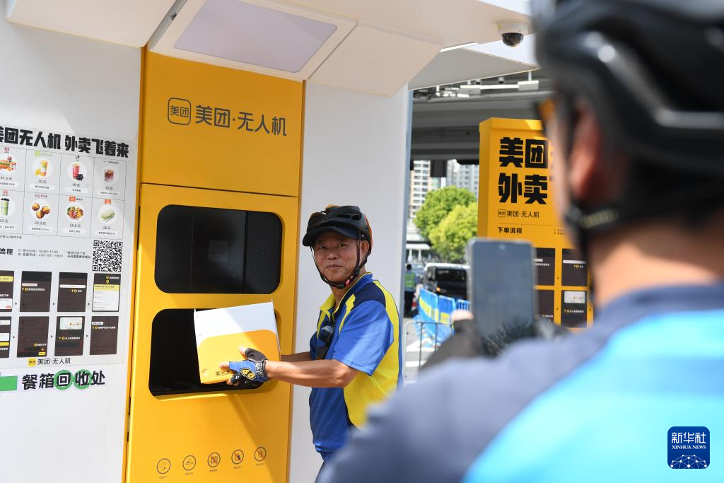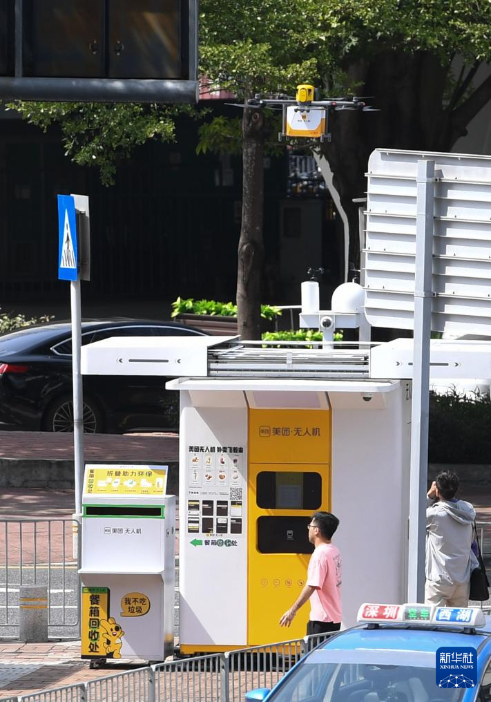 10月23日,在深圳福田口岸,搭载着餐食的无人机准备降落在无人机空投柜上。