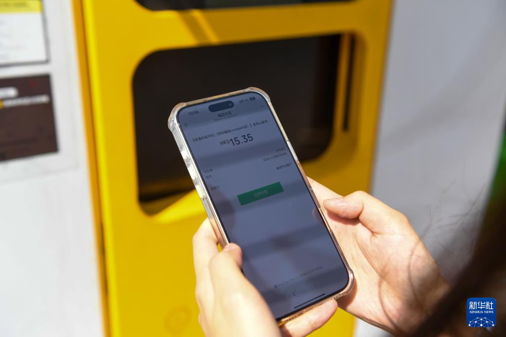 10月23日,香港居民在深圳福田口岸体验无人机外卖服务时,通过手机支付直接用港币结算。