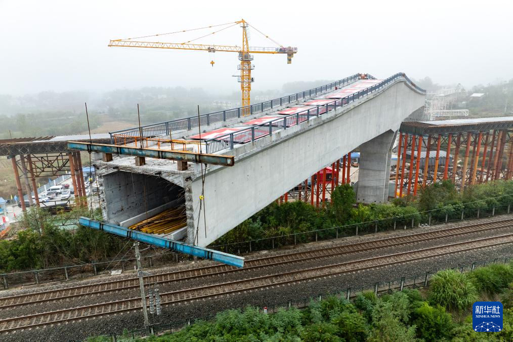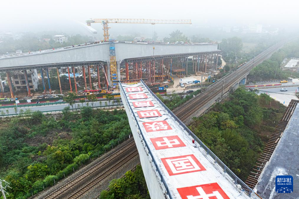 10月23日拍摄的湖北蕲春长胶廊道跨京九铁路连续梁转体作业现场(无人机照片)。