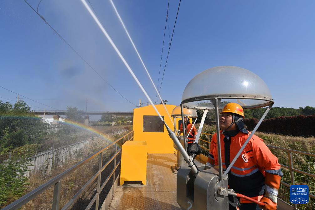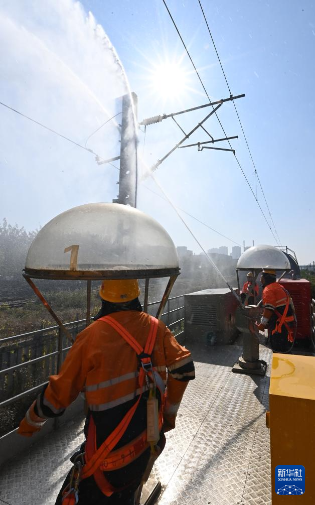 10月23日,天津供电段的职工在冲洗铁路接触网绝缘部件。