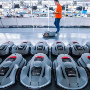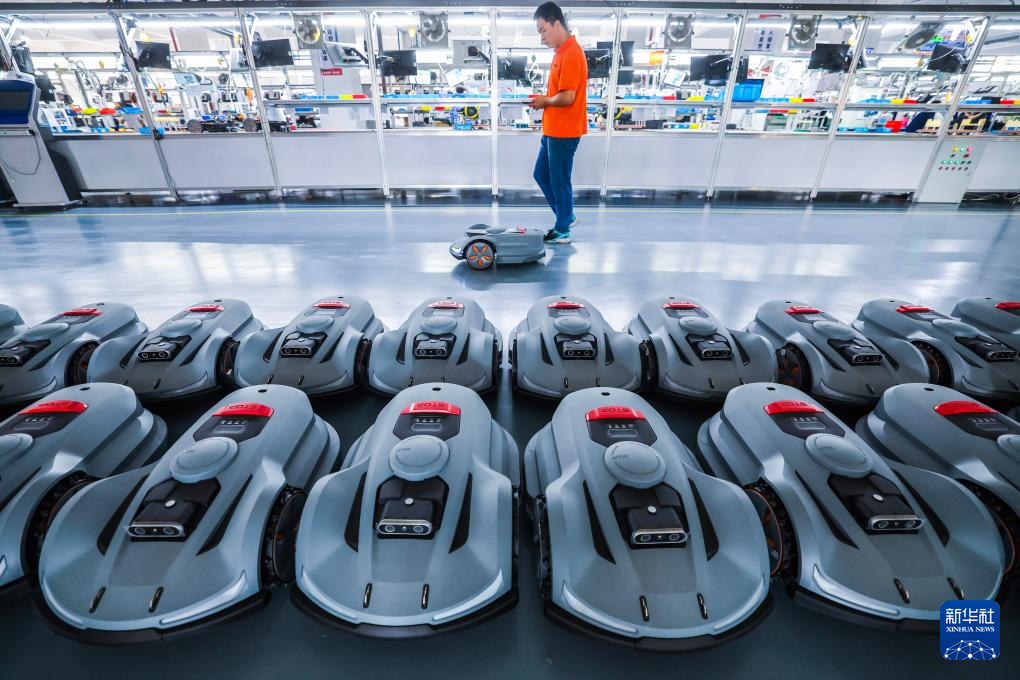 10月23日,在位于金华市金义新区的浙江白马科技有限公司车间里,工作人员测试智能割草机器人。浙江白马科技有限公司是国内规模较大的园林设备生产商,产品以出口为主。