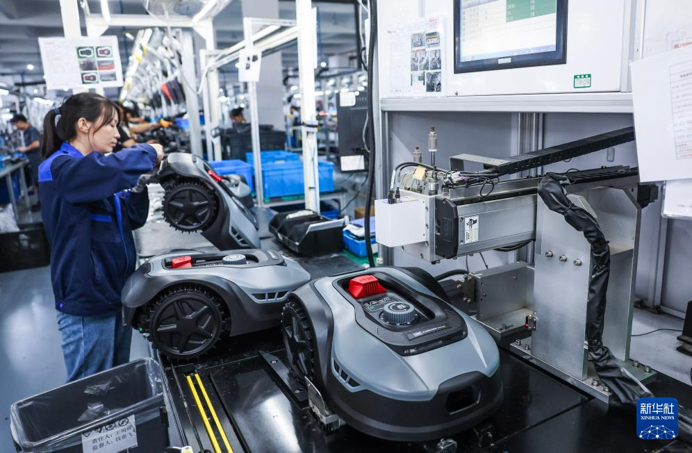 10月23日,在位于金华市金义新区的浙江白马科技有限公司生产车间,工人组装智能割草机器人。浙江白马科技有限公司是国内规模较大的园林设备生产商,产品以出口为主。